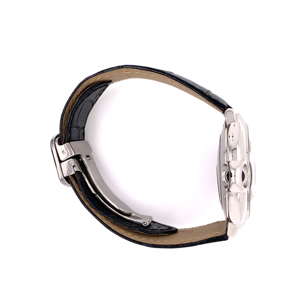 Fitted with its original black crocodile skin leather strap and secured by a stainless steel fold-over clasp, the watch exudes understated luxury. It comes complete with its original Cartier box and papers, a testament to its authenticity and care.